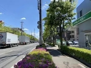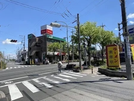 交差点まで来たらラーメン屋さんを右へ曲がり、けやき通りを南に進みます。